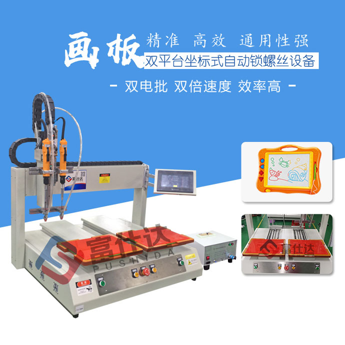兒童畫板自動鎖螺絲機(jī)采用富仕達(dá)雙平臺坐標(biāo)式,配置2把電批一次同時擰好2顆螺絲,效率提升2倍,設(shè)計可調(diào)式夾具,滿足多產(chǎn)品生產(chǎn)要求。
